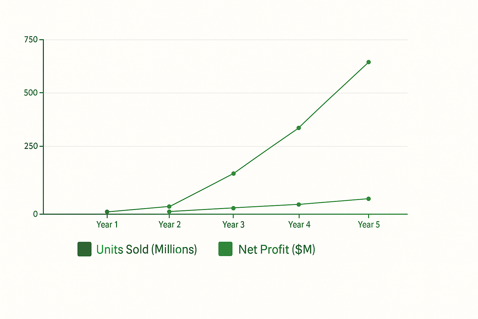 GT3 has been able to maintain a consistent 45% profit margin throughout the growth phases of our business. Not only do we offer a scalable model with decreasable per-unit costs at volume, but The Napron is projected to grow at a rate of 750% in terms of units sold from year 1 to year 5. Our revenue potential is 1 billion revenue by year 5.